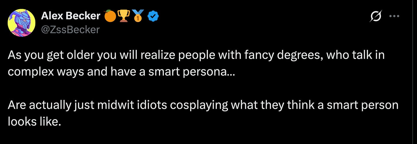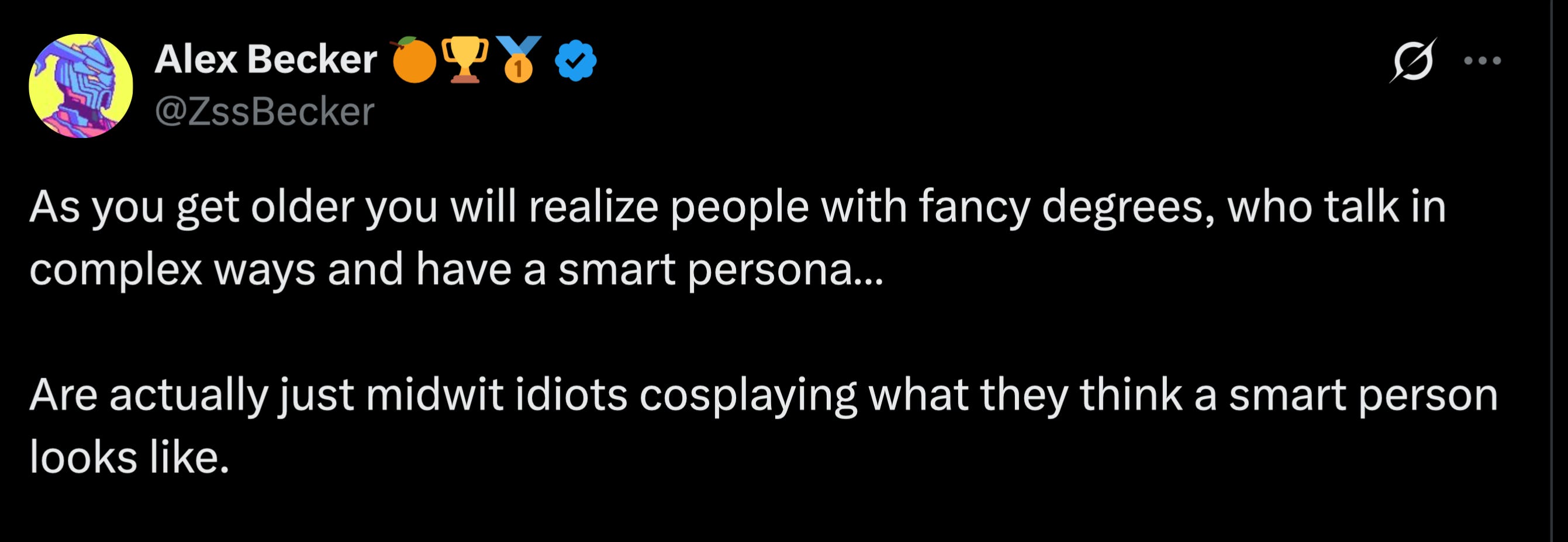 These are actually just midwit idiots cosplaying what they think a smart person looks like. — Alex Becker