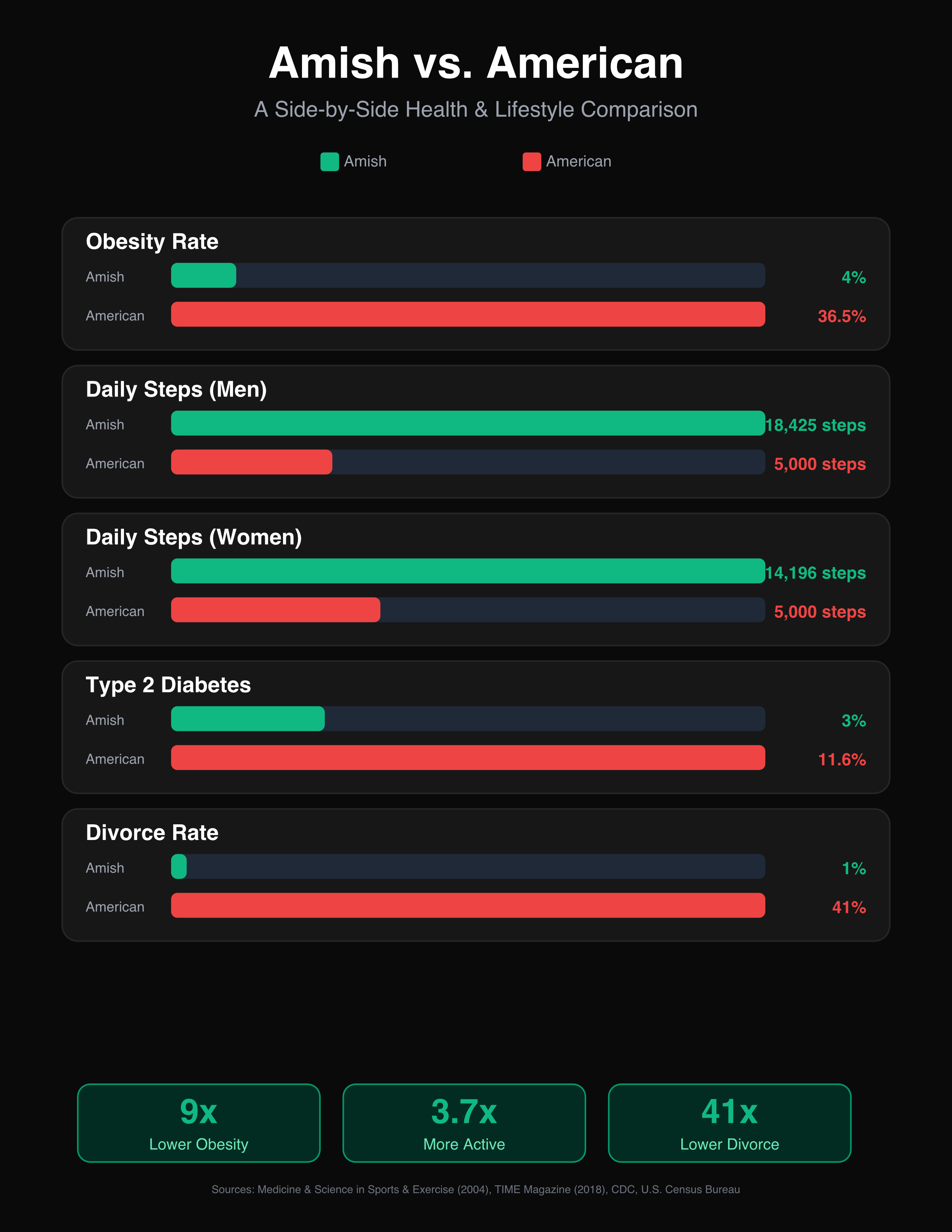 The Amish have certain health advantages that make the rest of us look pathetic. Studies have found lower rates of cardiovascular disease, obesity, and type 2 diabetes compared to the general American population.
